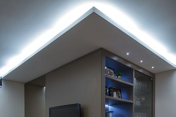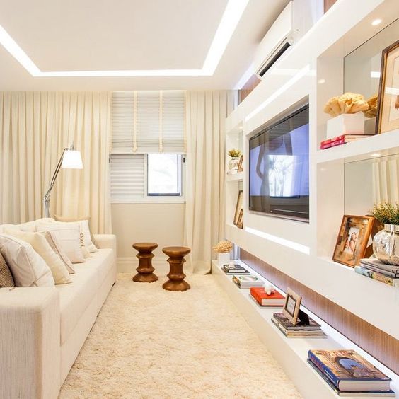 Os painéis de gesso são decorativos e elegantes, mas os nichos de gesso também são uma opção moderna para as salas de TV, dando um toque de luminosidade ao local.